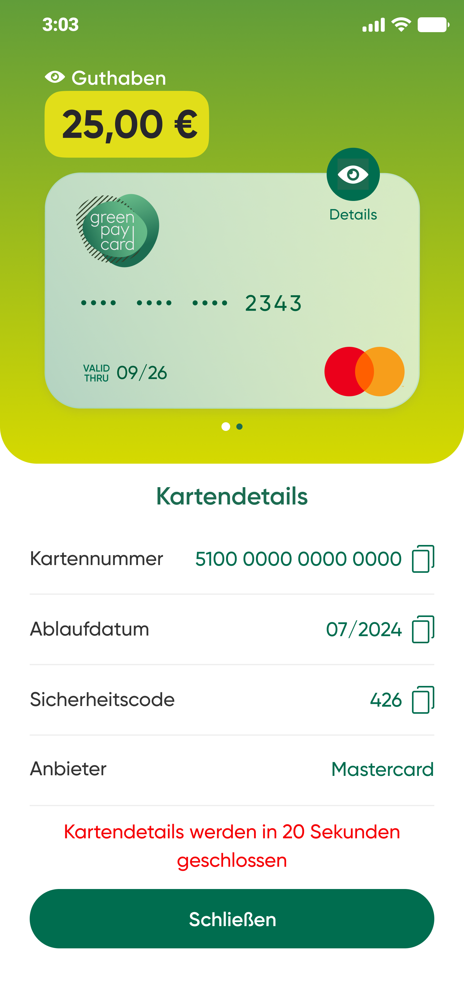 Da die greenpay card nur für den digitalen Einsatz gedacht ist, erhältst Du keine Karten-PIN. Für Zahlungen benötigst Du lediglich Deinen 3-stelligen Sicherheitscode. Diesen kannst Du in Deiner greenpay App einsehen.