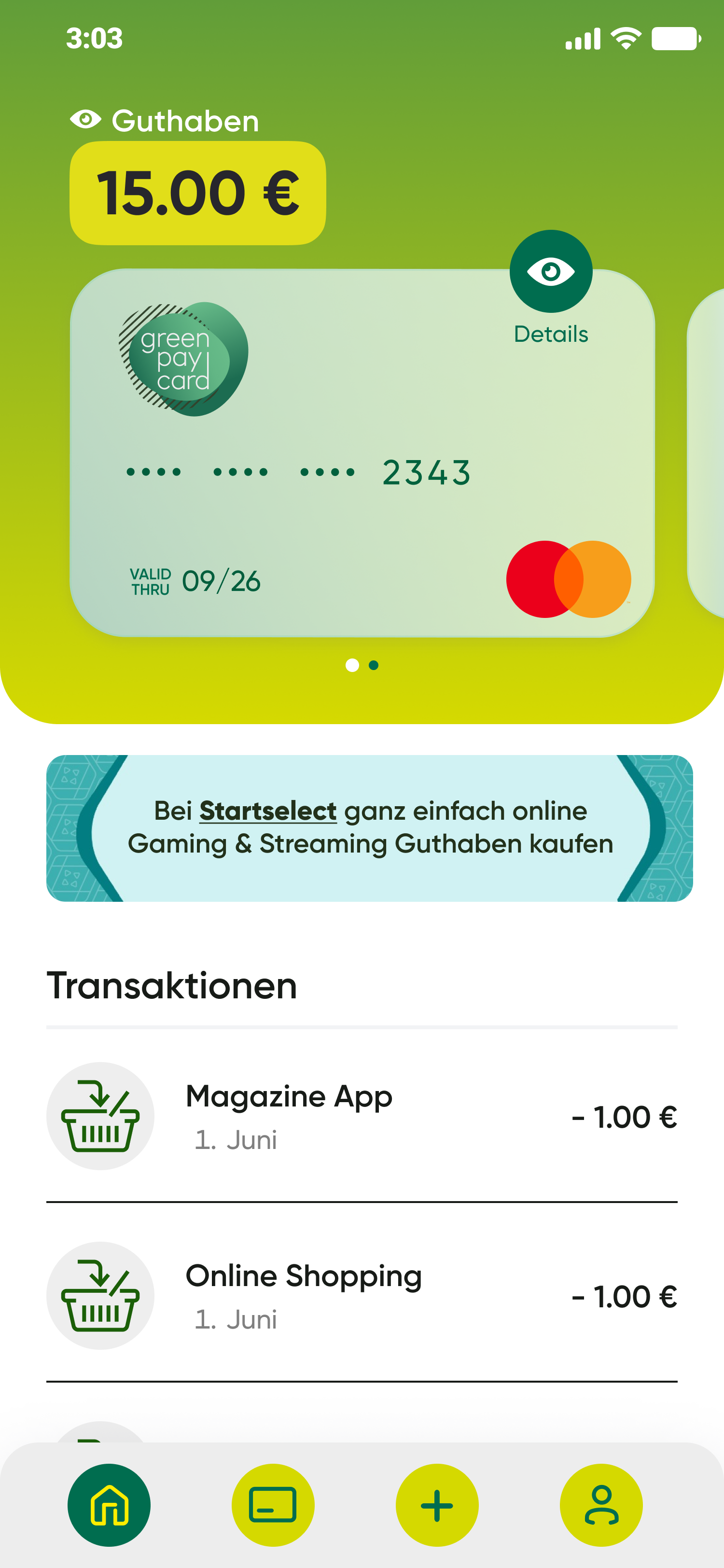 Für wiederkehrende Zahlungen wie Abos kann eine prepaid Mastercard wie die greenpay card häufig nicht hinterlegt werden. Einfach und sicher kannst Du aber Guthaben vieler Gaming-, Streaming-, Entertainment- und Shoppingangebote mit Deiner greenpay card auf www.startselect.com erwerben. Klicke auf den Startselect Button in der greenpay card App und Du wirst automatisch in den Shop weitergeleitet.
